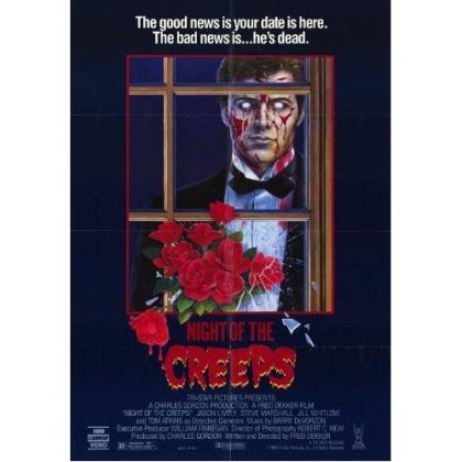 For years I had thought I had seen Night of the Creeps from 1986, infact I swore it was a mediocre, at best horror flick from the 80’s. I had seen the cover, T-shirts and have even talked to people though breifly about the movie as if I had seen it. Well when it arrived in the mail for me from my online dvd account, I will admit when reading the description on the sleeve I was a little hazy on what I really remembered of it. When I started it, it was perfectly was clear. I had NEVER seen this movie before. Really now, would I EVER forget a movie from the 80’s that starts off with an opening sequence as rad as this?! NO!