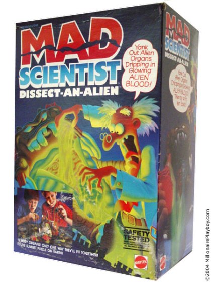 Even better yet.. was the Mad Scientist “Dissect an Alien” kit from 1986 which well let you open up and alien and take out his internal organs. Inside the alien was, you guessed it some slime or as the Mad Scientist called it glowing alien blood! Whatever!