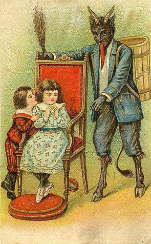 “Krampus is a mythical creature who accompanies Saint Nicholas in various regions of the world during the Christmas season, especially Austria. The word Krampus originates from the Old High German word for claw (Krampen). In the Alpine regions, Krampus is represented by an incubus-like creature. While Saint Nicholas gives gifts to good children, the Krampus warns and punishes bad children. Traditionally, young men dress up as the Krampus in the first two weeks of December, particularly in the evening of December 5, and roam the streets frightening children and women with rusty chains and bells. In some rural areas the tradition also includes birching by Krampus, especially of young girls. Images of Krampus usually show him with a basket on his back used to carry away bad children and dump them into the pits of Hell.