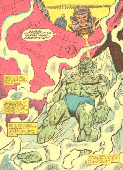 These issues take place at a time when the Hulk first gained the mind of Bruce Banner. In fact the Hulk had recently been pardoned and asked to rejoin the Avengers. Anyway these issues have all that you want in a classic hulk story line, three of the Hulk greatest enemies and lot’s of smashing. Now to summarize the plot you basically have General Thunderbolt Ross teaming up with Modok in a plan to use the Abomination to acheive both of their evil goals.