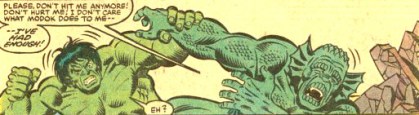 Ross’s is to use him to once and for all finally destroy the Hulk. Modok, who also mentions he’d like to see the Hulk pummeled but more so wants to use the Abomination to destroy A.I.M.. The only problem is that the Abomination is simply scared shitless of the Hulk and at first refuses to fight him again, claiming their in last battle he got his ass served to him way too bad . These issues show the Abomination at his most whiney and pathetic. Most of the time he’s crying like a baby in the fetal position while Modok kicks his ass with his mind beams raising his anger and getting the Abomination to fear him more than the Hulk. This alone makes it worth checking these issues out.