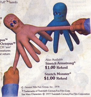 Thinking of Stretch Monster has also led me on a wild goose chase on the internet today desperately trying to figure out the proper name to one of my other favorite monster toys from the 80’s. This particular toy monster was green as well and infact quite similar to Stretch Monster in looks. He was probably almost 2 feet tall, green and actually kinda resembled Whiplash from the Masters of the Universe line of action figures. The cool thing about him was that you could crush him into a ball as he was filled mainly with air and then from what I remember you could inflate him back to his normal size by pulling something on his belt? Does this ring a bell for anyone?? Anyway if anyone knows what I’m talking about please let me know-it’s killing me as I’ve been searching on ebay and You Tube for commercials of this bad ass! Anyway the thought of Stretch X-Ray once again proves that vintage monsters still rule the school!!!