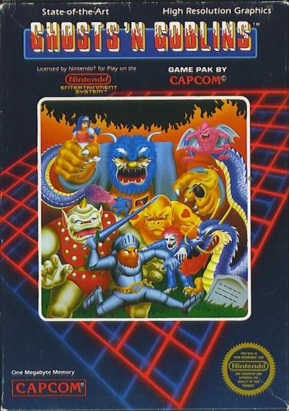 I was thinking this morning for some reason about fun it used to be when I was a kid in the 80’s and I’d spend a far too hot summer afternoon with my friends playing Nintendo in my brother’s room in the basement. Those were good times, eating chips, drinkin’ pop chilling in the cool basement and most of all playing video games. These definately weren’t the games of today with ultra realistic graphics and a controller with like fifty buttons on it. Nope, these were times when video games were actually fun to play!! Simple and to the point, well most of ’em at least. We’d play ’em all back then, Super Mario Bros, Castlevania, Rygar, Mega Man and one game in particular which drove us fucking bat shit crazy- Ghosts ‘n Goblins!!! Just seeing the packaging alone for this game here below brings back so many nostalgic memories of the 80’s and many extremely frustrating ones as well!
