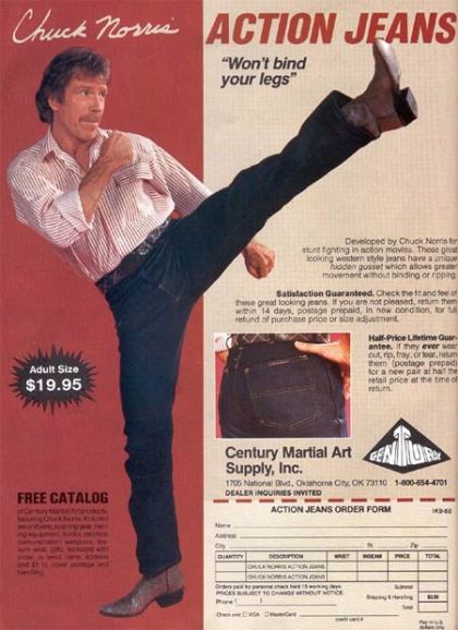 I remember seeing ads for these pants back in the 80’s when I was a kid and I always thought they were funny but today I guess it really dawned on me that they are actually super fly! Look closely at the crotch as they have a super stretchy area so that you can kick really high and not split your pants. Well I tell you only Norris could come up with something like these for the public. I bet too that it hurt like hell back then to be kicked in the face with those bad ass cowboy boots he’s always wearing too! So yeah I will find a pair-I will keep you posted!!