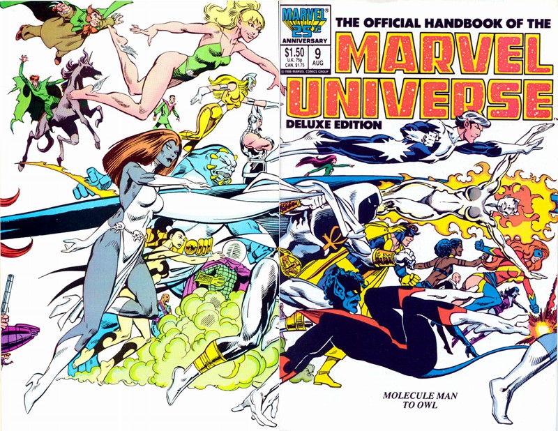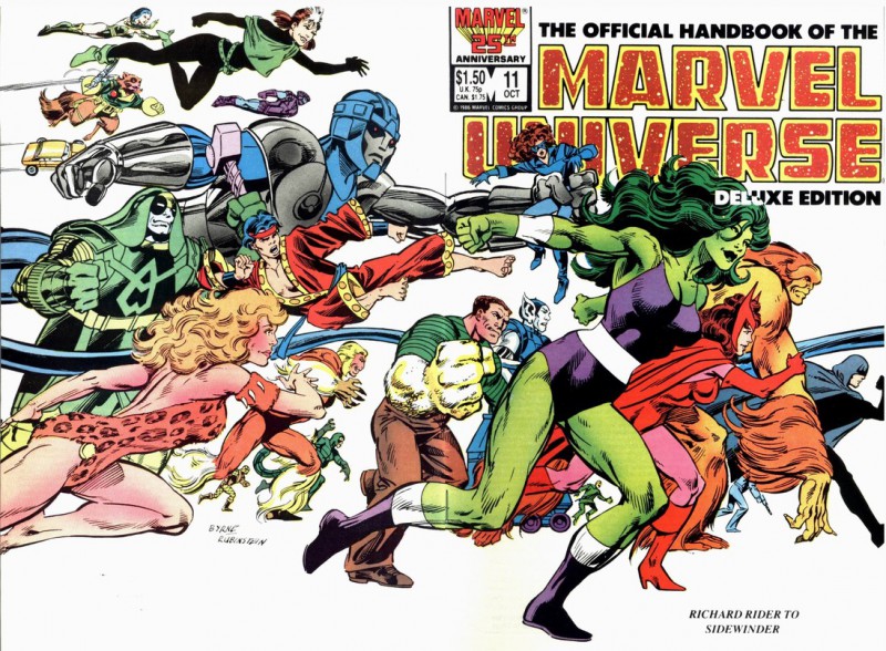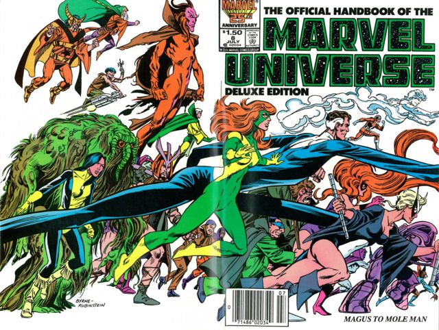 Each character was drawn by a different comic book artist and it included pictures of the characters in action taken from panels in the comics they’d appeared in. But my whole point here was to talk about the covers which the majority of them were drawn by my personal favorite John Byrne! The cool thing about the covers was that they could all be connected as one super duper long cover of the characters running. So Byrne pretty much tried to include all the characters from each alphabetical issue!! I’d love to see a video montage that follows each issue until it’s end! But until then I’ll include as many of these covers I can find right here! Check this out!
