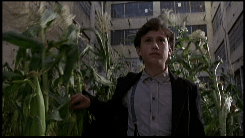 Well the new setting seems to be a good one for one of the ‘Corn kids’, soon the older of the two is dressing like he’s the coolest new dude on the block and quickly discovering he’s got a fav new interest that quickly replaces corn: girls!! This new style doesn’t sit well with the younger ‘corn obsessed’ brother and soon he goes on a mission to find a vacant lot to plant some new evil corn, hell his yuppie stepdad even tries to get in on the corn action too. He find’s his stepson’s new utterly incredibly delicious crop of corn flourishing in some shitty soil in a vacant lot between two crumbling warehouses and immediately sees dollar signs! Yeah, he eagerly talks to his new kid about selling out his new breed of corn to a big corporation so it can be eaten all over the world. Naturally the evil kid’s elated and then moves on to convince the local gang bangers and school bullies to start listening to his crazy corn sermons! Soon their all hooked on his schtick and it’s up to his older, newly hipper, formerly amish brother to put and end to his evil plan.