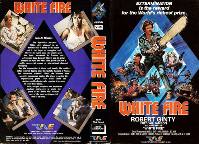 ‘White Fire’ from 1984 is one helluva bizarre movie, it’s not only filled with a ton of crazy ass action sequences but it’s also got a complete WTF plot going for it that you kinda just have to see to believe. ‘White Fire’ starts off with two siblings (Bo and Ingrid) who witness a gang of crazed soldiers sadistically murder their parents. There’s fully over the top action kicking into gear right from the very start including a bonkers attack on the kid’s dad with a flame thrower that you just gotta see to beleive. It’s one of those “rewind & watch it again” scenes as the stunt dude is completely bombarded with a flame blast with no head or face protection, and for an instant the guy is fully engulfed in flame. Anyway only the two kids manage to survive the bloodshed. Flash forward twenty years later… Bo and his beautiful sister are grown up & employed at a hi-tech diamond mineshaft operation located in the desert that looks straight out of a 1960’s sci fi flick. The inseparable pair soon stumble upon the discovery of a legendary supernaturally powered diamond, called the “White Fire.” Both are immediately pursued by a gang of evil villainous thugs who’re dead set on getting their grubby hands on the diamond themselves. Check out this radical poster/box art for the flick: