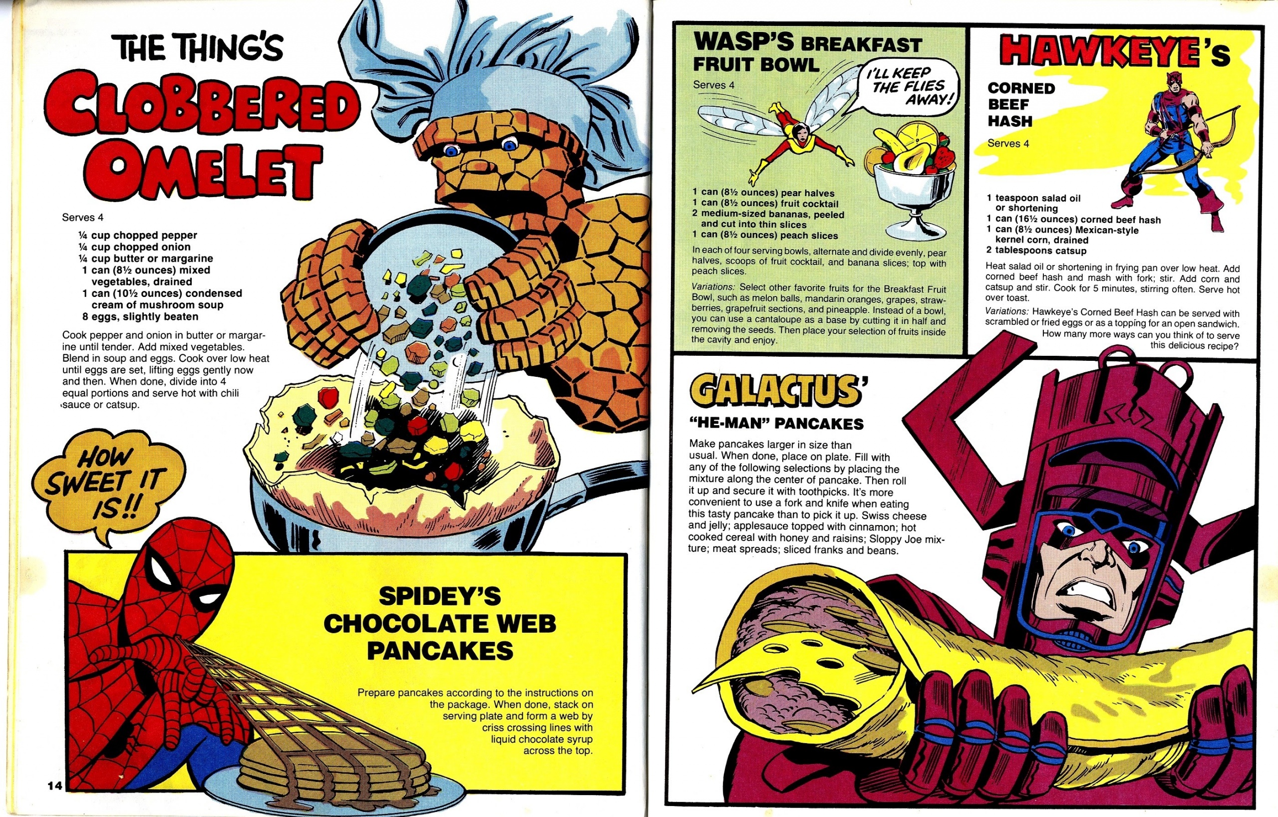 This was way back when things were a bit simpler and people had more of a sense of humor about stuff in a way that people of the Earth in 2020 can’t quite seem to comprehend. Now I’m not quite sure just how tasty these recipes actually are but they’re certainly fun to check out. It’s got the art of Joe Giella who also did the Marvel fitness book which is awesome too. Anyway take a gander at some of these hilarious recipes when superheroes were still full of wonder and just plain fun..