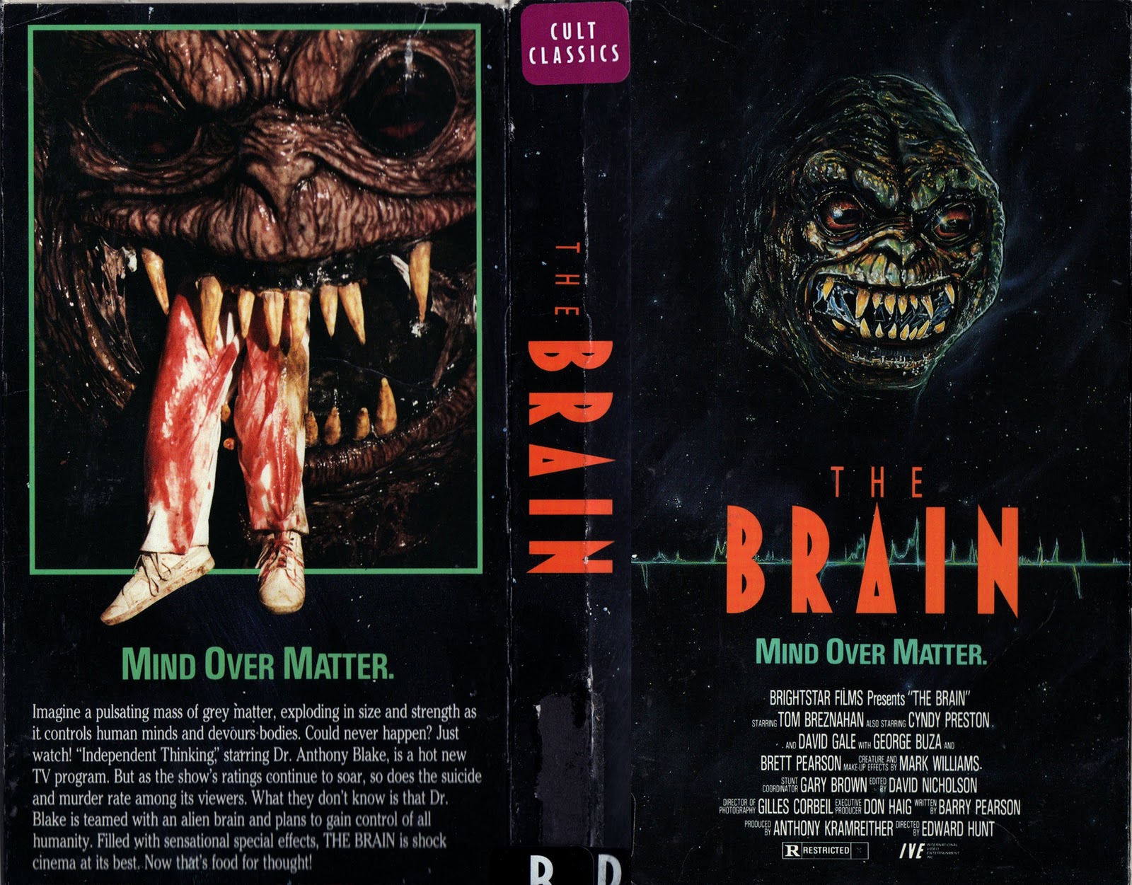 Well is it worth the trouble to track down and check out this 2020 holiday season? YES! The Brain has everything I love in an 80’s horror flick. Cool likable characters, a wild giant rubbery monster, plenty of action and a ridiculous plot reminiscent of those classic 1950’s sci-fi creature features. Creepy ass Dr. Blakely (the dude from Re-Animator who loses his head-and does in The Brain too!) runs a seemingly normal TV show called “Independent Thinkers”, a popular weekly “self-help” program. However he’s not making his audience any wiser, he secretly serves an alien organism called The Brain, that brainwashes (duh!) the viewers using it’s other-worldy mind control techniques. It’s also got a hunger for human flesh & as it consumes it’s victims it also increases in size. The only one who stands to save the city and possibly the Earth is a wise crackin’ teenage practical joker and his super cute stylin’ girlfriend.