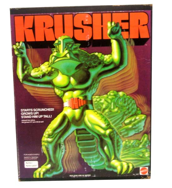 Ok after my plea from my blog earlier today for someone to reveal to me and in a way reunite me with one of my all time favorite toys as a kid I got a speedy response from my friend TJ! It turns out that I was on the right track as I tried to remember the name of one of the coolest late 70’s toy monsters, Krusher!! I was searching for Crusher instead but now have found some rad images of him and a strange Youtube video as well. First off here’s what he looked like on the cover of the box he came in! What a bad ass huh?? You could deflate him and krush him up into a ball-then inflate him usuing his nifty belt!